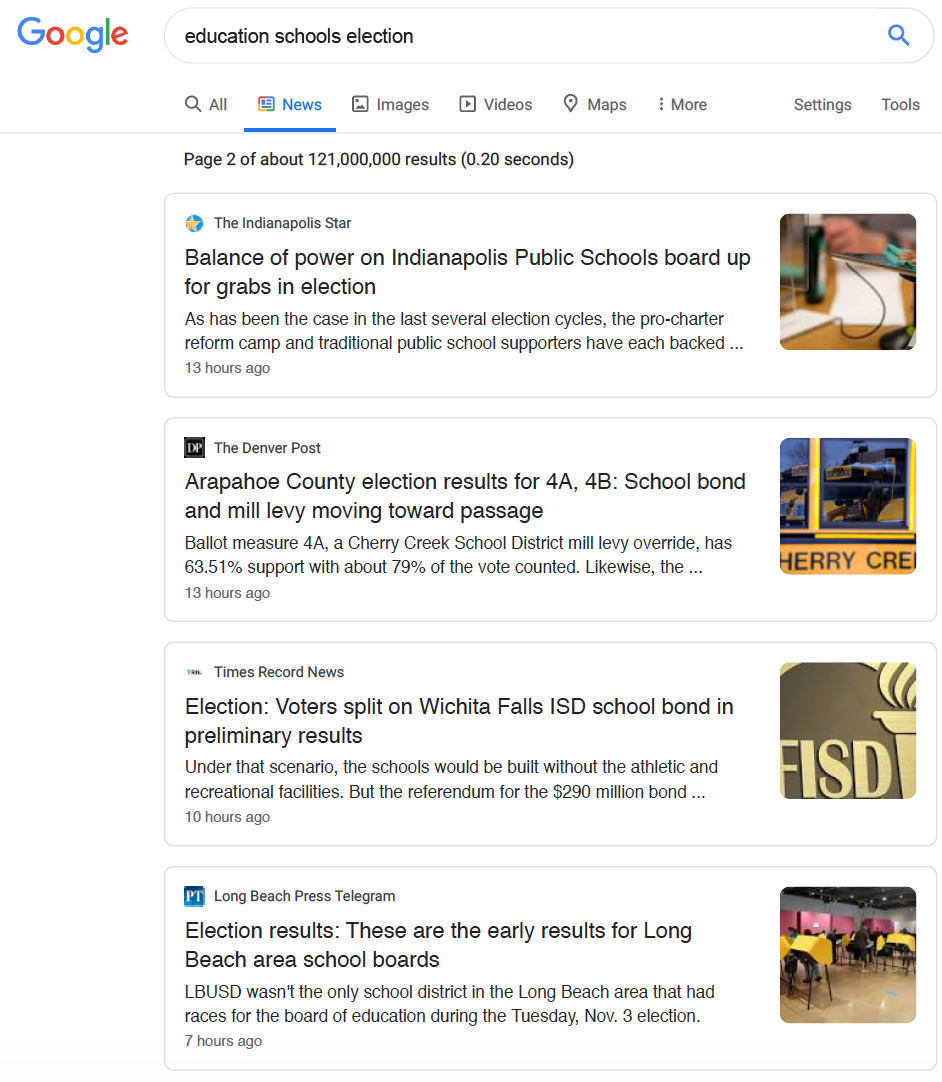 Ballotpedia provides links to an extensive set of overviews and results of national elections, ballot measures/issues, state-by-state elections, and school board elections, and google searches of education and elections turns up many stories on local ballot measures and school board races.